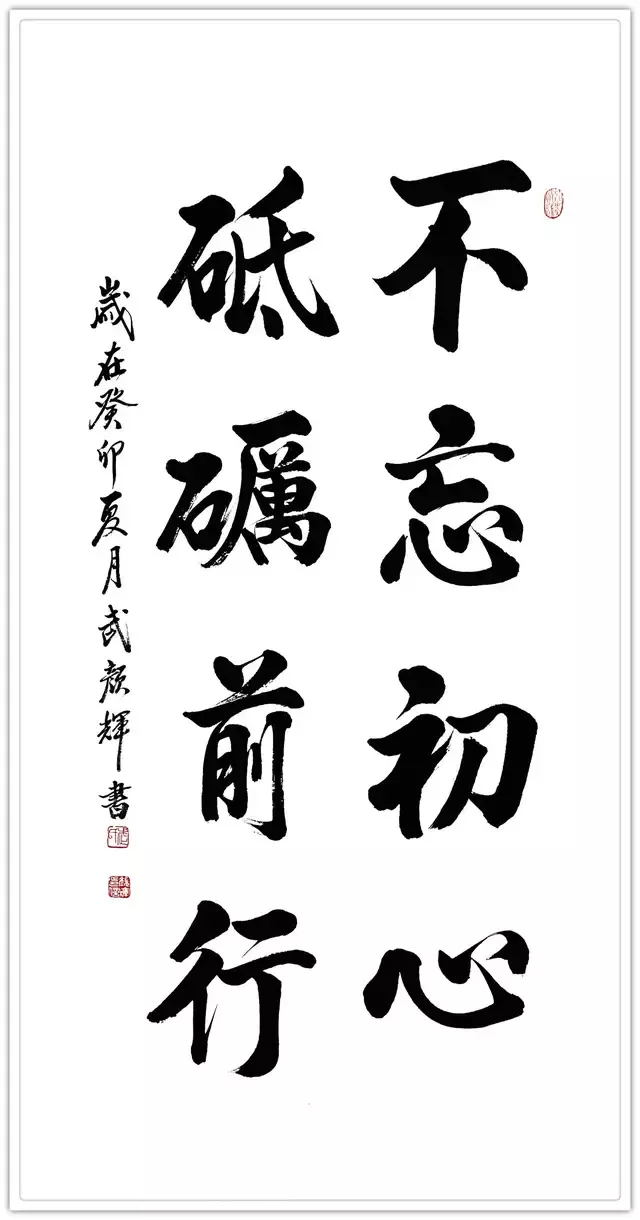相对于横涂竖抹,大喊大叫,针喷水泼的变形“创新”,他始终不为所动,而是踏踏实实地其继承了晋唐风韵的传统笔法,其结字之端庄厚重、浑然大气、骨力洞达,笔力刚劲,力透纸背,锋芒内敛,笔笔传神,笔姿之爽朗洒脱,让人心旷神怡;其线条的曲直、长短、粗细各有妙处,最具价值所在就是创作之精诚和技法之娴熟流畅;其点画如铁画银钩,表现了一种刚毅倔强,风流潇洒之气,运笔的脉络交代得也十分清楚;其结构庄重优美,肥瘦并施,重心安稳,神采抑扬适度,俊逸典雅,看似平常却奇崛,观之可见,柔中显刚劲,遒逸露姿媚,给人以突出、稳健、灵动的艺术享受,亮点纷呈,特点突出,个性鲜明,精诚所至则能动人,虽是一纸静态画面,却完美凸现其动态的韵律;其势之大、其力之沉均表现出其功力所在,渗透着力与美的张扬和平衡,生动表现了作者刚直、爽利、豪放的性格和独到的艺术风格。