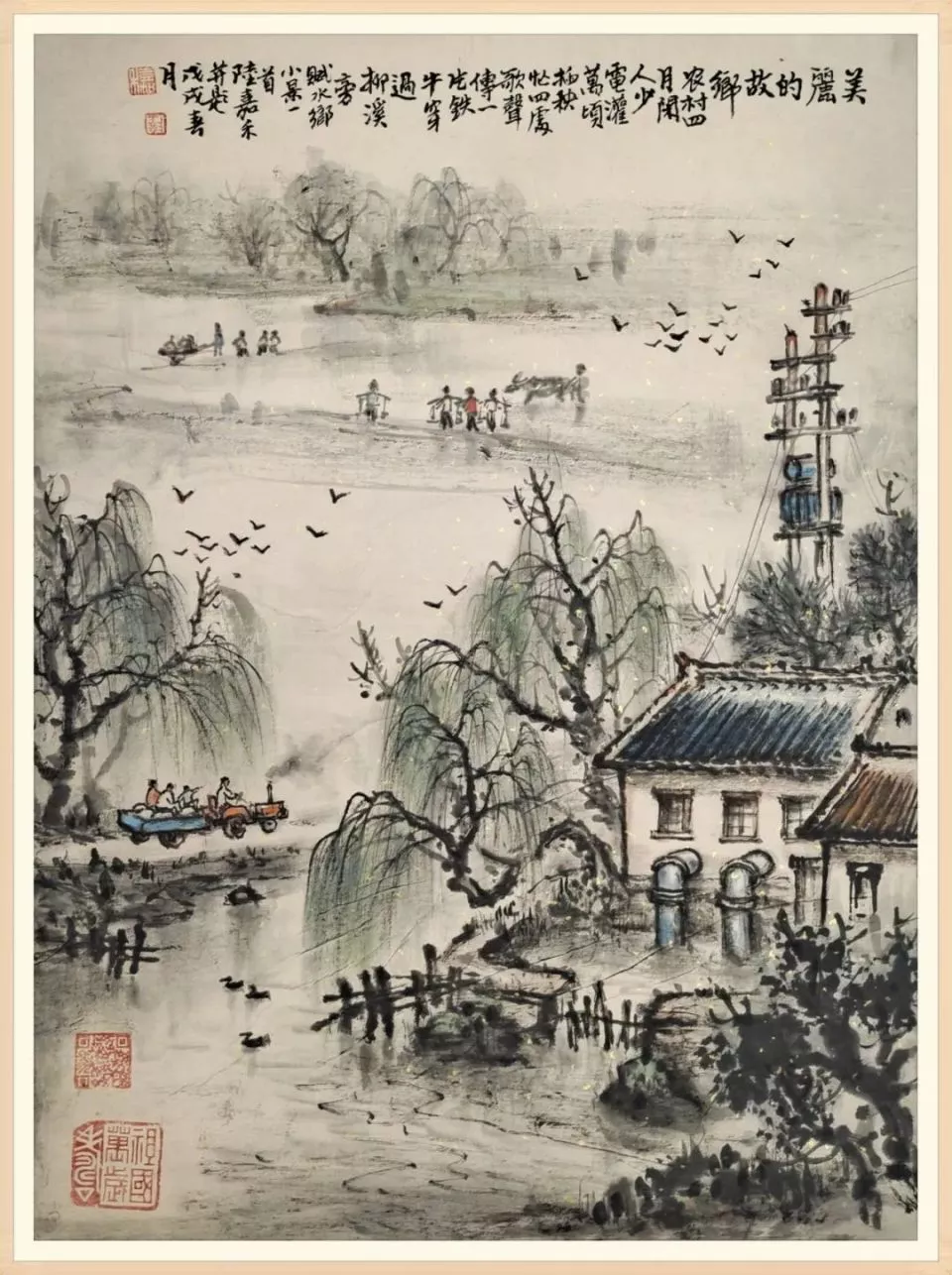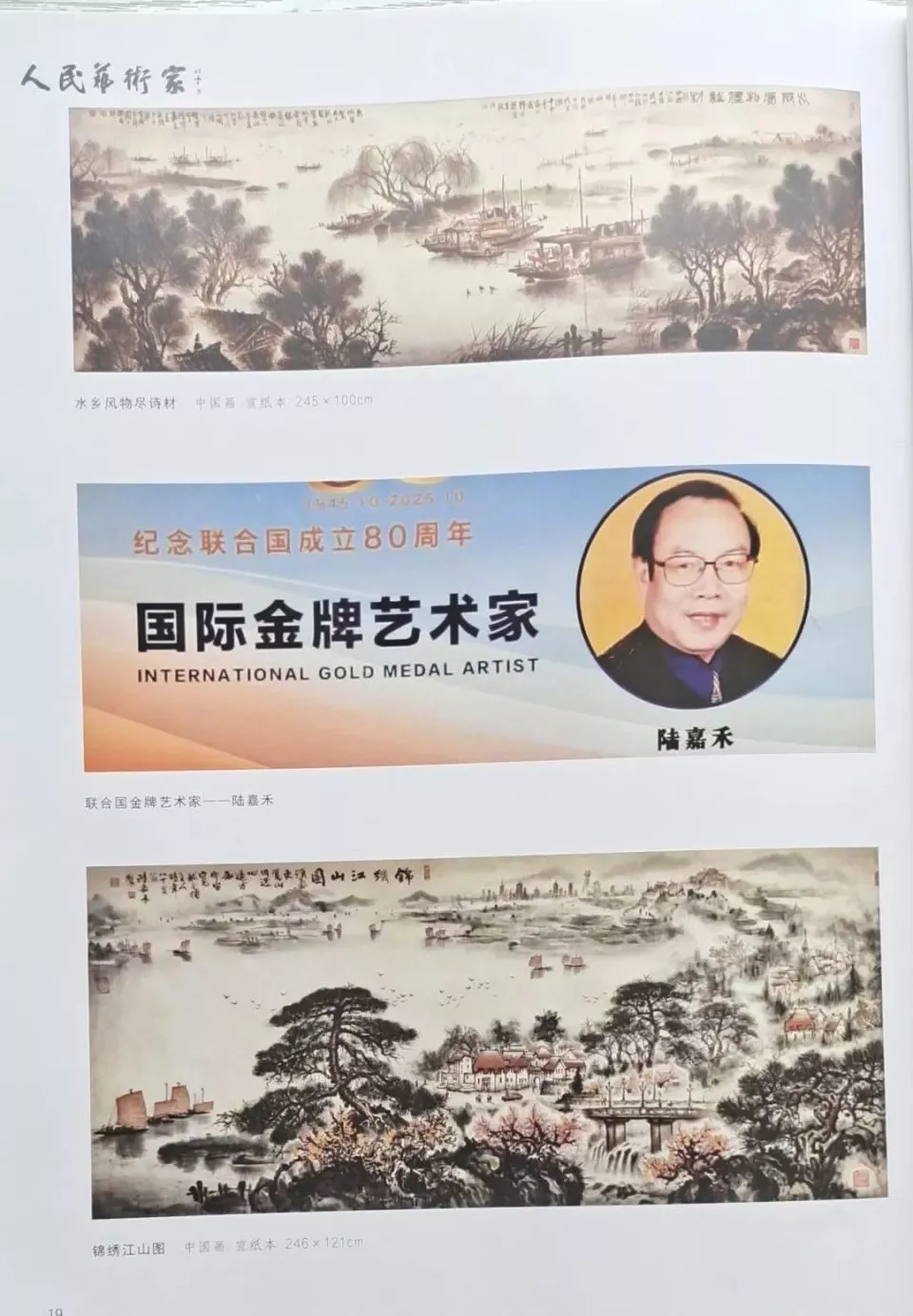 庆祝中华人民共和国成立75周年。中国共产党中共中央宣传部颁发著名书画艺术文化名家暨"四个一批人才"一一陆嘉禾荣誉称号及证书。对陆嘉禾最美水乡水墨丹青优秀成绩和贡献肯定和鼓励!囯庆十月一日人民日报特刊整版的水乡作品和书法专题报道和推广宣传。