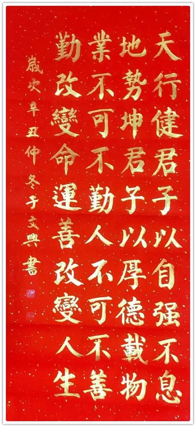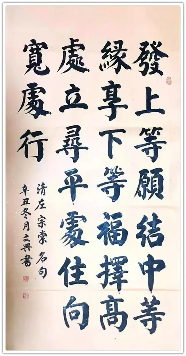 笔势论有言,书法之法在于变化。上下齐平,左右方整,平曲相似,此不谓书!仅得点划尔。写这种书法形态的人,比比皆是!于文兴不但有书法实践的丰厚,也有书论研究的精深,所以他的书法习成是理论与实践的双重加持,每每作书法,必依书论,写透古风。上下非齐平,左右非方整,平曲有别,写得平欹相成,虚实相生,中宫作于紧,八面显于达,书法最有抒情畅志的表达。是壮志盈于胸可作龙跳天门、虎卧凤阙的恣意抒发。这样的书法,他自己写得相当痛快,别人看在眼里,也有大振心颜的觉意。楷书能输出如此丰富的魅力,这一定是艺术达峰巅,功夫化纯熟的结果!