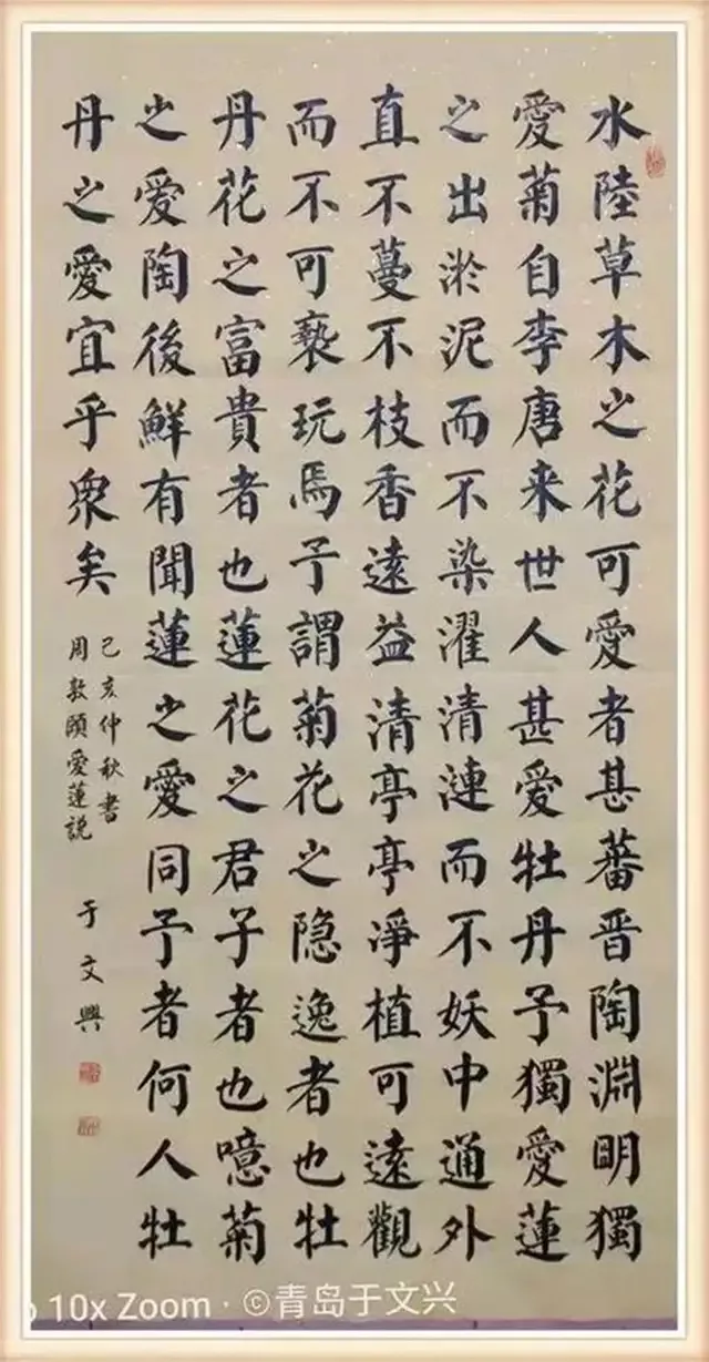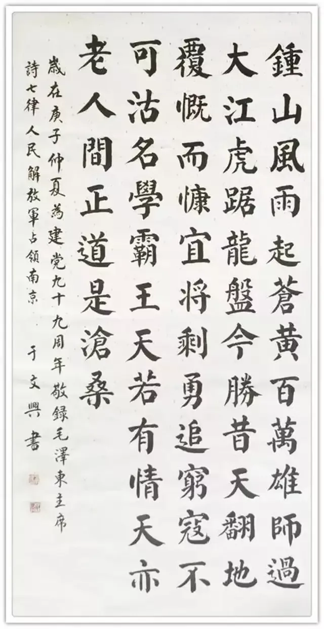 楷书一体是文化承载的重要平台,也是大众审美聚集的笔墨功夫。练就一手楷法无欺的硬功夫,当是书法家的必须之能耐。但是当代书坛,像于文兴先生这样,有持久磨砺楷法严谨的大手笔,已经是稀有鲜见。所以他的楷书必有引领书法文化复兴重构的价值!要论当代书坛,楷书写到正大气象者是那家?于文兴必是功建先锋之一,具备令人折服的楷书正能量!