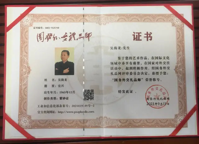 吴海龙,1965年12月出生于江苏宜兴,汉族。吴氏陶艺第五代传人。吴海龙,早慧,幼随父习艺,自幼薰艺家风,承前启后,把吴氏绝艺发扬光大!50多年来虽有风风雨雨,坎坷曲折路程,但最终坚持至今,续父亲叮嘱:一以贯之传承并创新,作品均以天然原材料为主,采用吴家传统工艺和创新技法,突出其精湛的技艺,自成一体,独创吴氏重传统更重创新的风格。紫砂作品多次荣获海内外国际性及国家级金奖,被人民大会堂、中国美术馆、中国农业博物馆等纷纷收藏,被泰国亲王、英国王子、美国硅谷、海峡两岸等的文化艺术大家们大加赞赏,也因一带一路文化交流被带出国门走向世界。其作品分别发表于人民网,新华网,中国书画网,雅昌艺术网,人民艺术家网,《人民日报》《光明日报》《中国企业报》《采风中国》《致敬新时代》《人民的艺术》《大国崛起》《引领时代的中国学者》《大国崛起·人才强国》。被《曲阜鸿儒书画院》聘为艺术顾问。