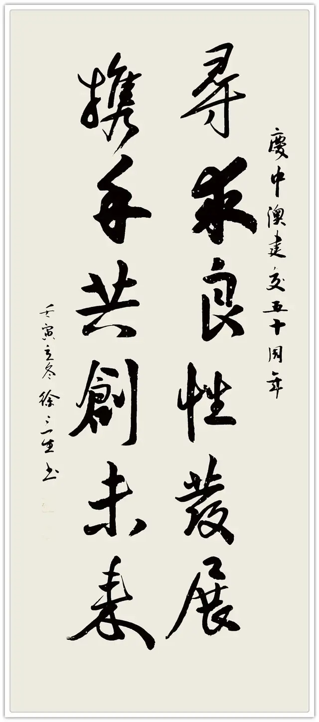 徐先生在书法艺术的道路上,始终以谦虚、恭敬的姿态向国内外的书法大家请教,广泛汲取精华,精进技艺。他的作品融合了古典与现代的精髓,既传承了传统书法的神韵,又不乏创新与活力,展现出独特的艺术风格。徐先生的书法不仅仅是一种艺术表达,更是一种文化的传递和心灵的修养。