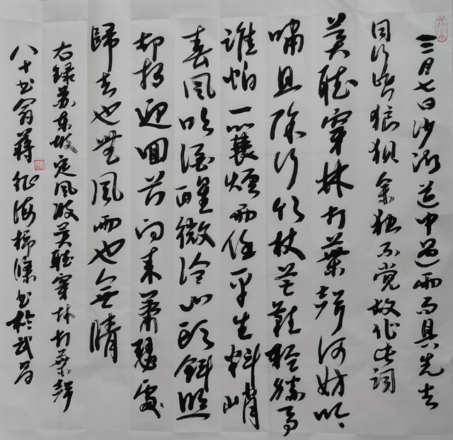 蒋征先生艺术创作的精神内核,归根结底是对真实的执着追求。在一个充斥着仿真与复制的时代,真实成为最稀缺的品质。蒋征的书法拒绝为展览效果而刻意设计,他的诗词不屑为迎合市场而故作姿态,这种艺术上的诚实品格在当今尤为难得。他的创作过程本身就成为了一种精神修炼,每一次笔墨行走,每一首诗作完成,都是对自我认知的深化与对存在本质的探索。"路漫漫其修远兮,吾将上下而求索。"屈子此言,恰可为蒋征艺术生涯作注。观其画作如见其人——孤而不独,傲而不骄,在传统与现代的交汇处,默默构筑着自己的艺术王国。其集约艺术创造思维,不断启迪青少年艺术教育,此般坚守,在当今实属凤毛麟角。艺术的永恒价值,或许正存在于这种不合时宜的执着之中。