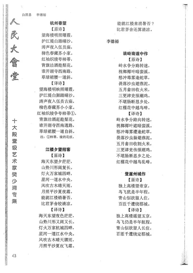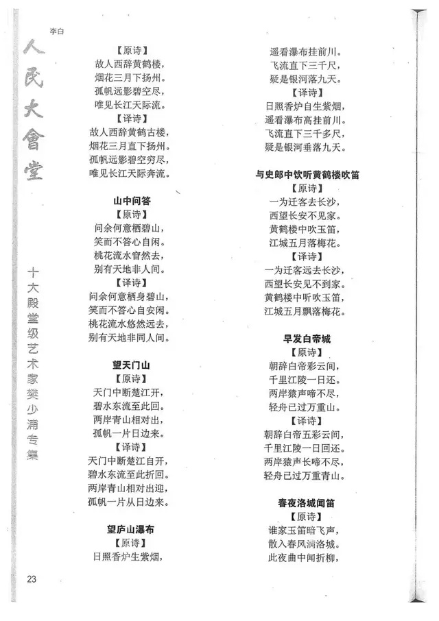 樊少浦《唐诗别译》(修订版)的显著特点在于:传"真”与变"新”的合谐统一。即既尊重原作,最大限度地保畄其原始经典形态,又以自创的八言律丶绝为载体,注入新的时代元素,从而打造古典诗歌的当代版。