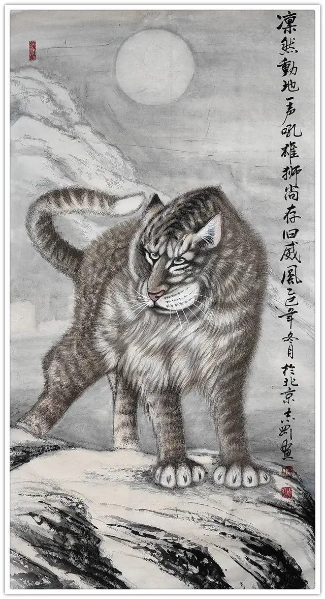 孙志刚的画作多次参加国际、国内书画大赛,先后数十次获得大奖,其中的奥妙就在于画家本身用笔用墨,气韵与意趣之妙,使她能始终坚持以灵性驾驭笔墨,在灵动、飘逸、率意、洒脱中体现出一种非常高雅的智慧。我对她的人品、画品总体评价是:“既有大海的品格,又有大海的禀性……”。画品即人品。孙志刚先生以绚丽而雅致的设色来烘托气氛,并紧紧把握动物之神形,用柔劲圆转的笔,稳健的线,深入刻画的五官、强调了四足的骨骼结构、须髯的疏密穿插笔笔到位,钢劲挺拔,以及皮毛斑纹的处理,显得细腻而洒脱。张口长啸,四肢配置,首尾造形,桀骜不驯的神态,正是一种王者之威的自然流露。