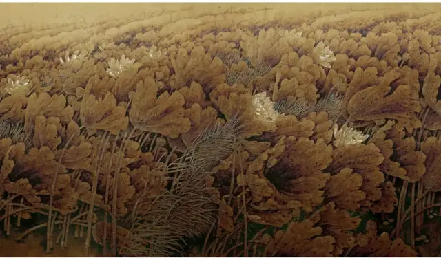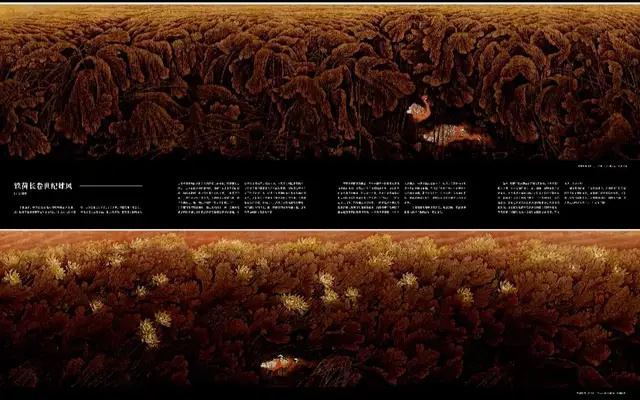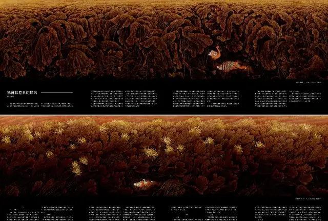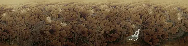 在整体布局上,画面虽独立成篇却气脉相连,形成了“十万大山的威严雄壮”。这种布局既借鉴了传统长卷“散点透视”的特点,又注入现代构成意识,使观者在移动视角中不断获得新的视觉体验。时而见局部荷叶的精工细作,时而感到整体画面的恢宏气势,达到了“咫尺千里”的艺术效果。“山有三远:自山下而仰山巅,谓之高远;自山前而窥山后,谓之深远;自近山而望远山,谓之平远。”刘德功将山水画的“三远”法融入花鸟画,使秋荷展现出“万里河山万里荷”的壮阔。