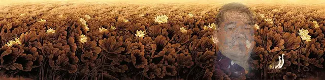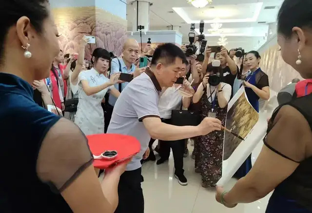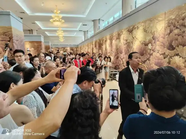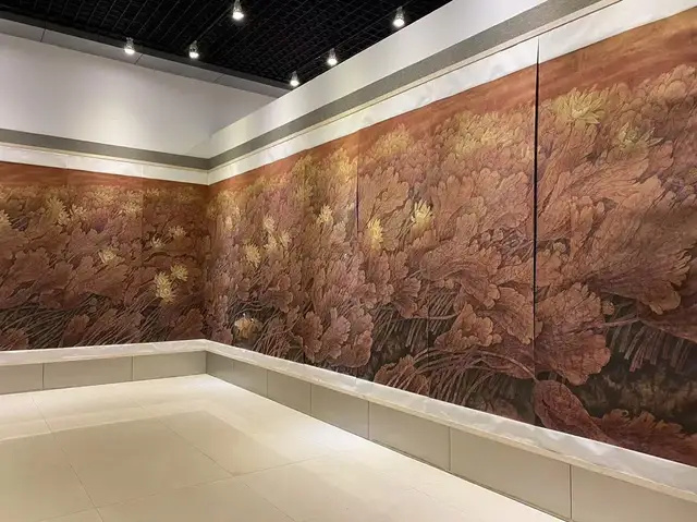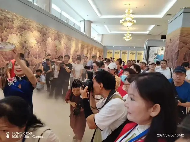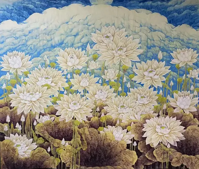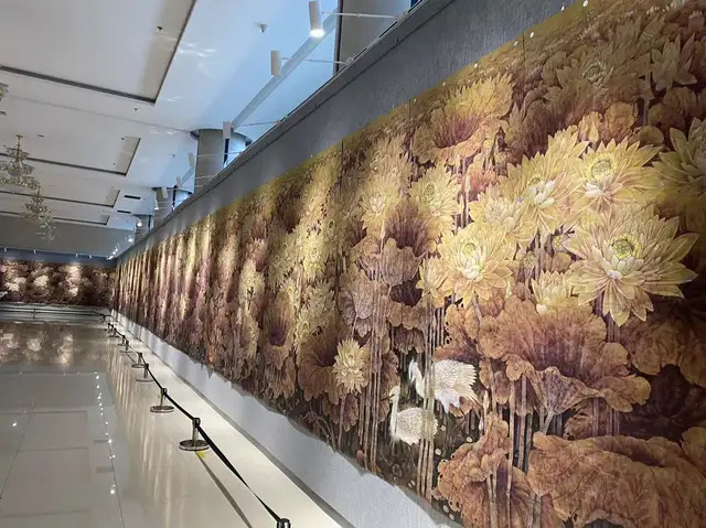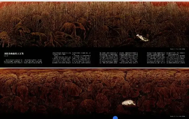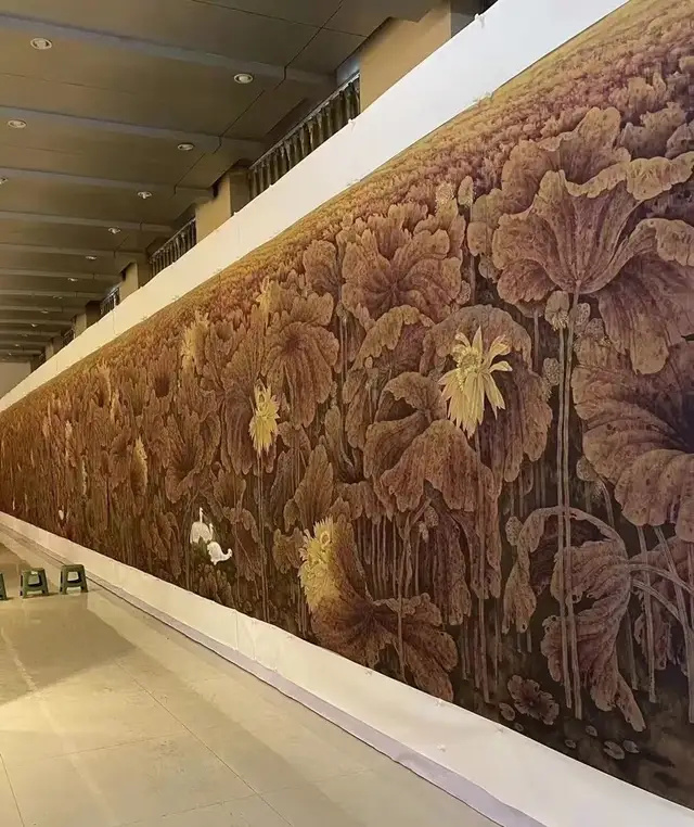 著名画家刘德功以十五载春秋淬炼出《铁荷魂》长卷巨作——2.5米高、132米长,承载着他一家三代军人的家国情怀,创新呈现由深沉到邈远的铁荷之境;颠覆传统工笔花鸟画范式,开创了“意写大工笔”技法体系;将金属锻造般的质感注入柔美荷韵,在刚柔相济中重构荷花的精神维度。