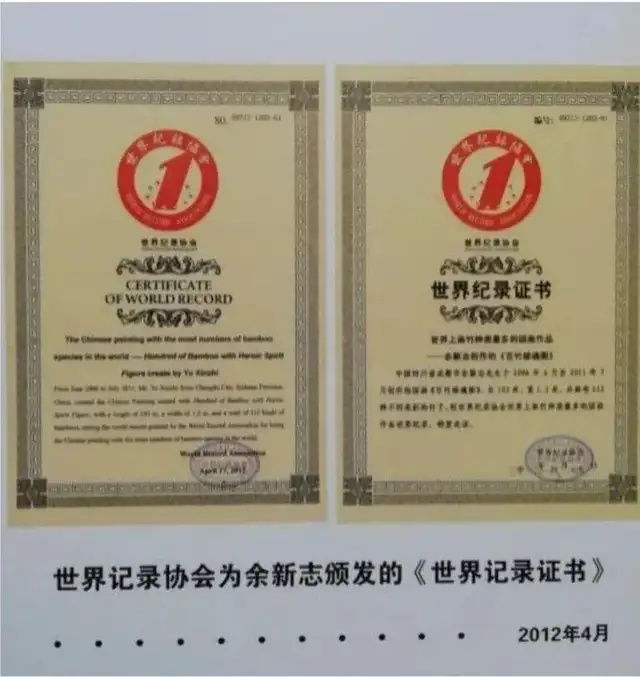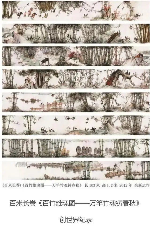 作者余新志先生自幼爱竹,迷竹,对竹有着心灵相通的特殊情结。画竹。演择竹的魂与美是他一生孜孜不倦的崇高追求。为了诠释从艺60多年来对竹的浓厚感情,彰显竹的精神风骨与文化内涵,集中展示勤耕不覆的艺术成果。作者历时五年,走遍大江南北,竹海森林,风霜雨雪,多方收集素材,写生上千幅,呕心沥血。终于2011年6月完成这幅长100米,宽1.2米的百竹长卷,用高超的表现手法画了121种不同类别的竹,创下了世界上画竹种类最多,最壮美的国面作品创世界记录。《百竹雄魂图》——“万竿竹魂铸春秋”,2012年4月世界配录协会特向余新志先生额发了创世界纪录证书。