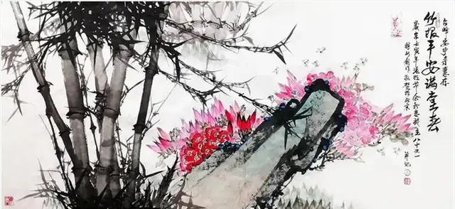 如此宏大的画卷,从整体结构布局看,十分严谨,壮观,千姿百态的各种竹石,花鸟、山水、动物,巧夺天工,巧妙严谨统一于百米长卷中,没有一点堆积重复之感,一部长卷,就是一部史诗、从整幅巨作表现形式看,他把中国画的笔墨发挥得淋漓尽致,既有浓厚的传统,又有新的表现手法,给人以老辣、大气,新颖、厚重、质量感。力度感、神韵感、现代感,独创感,美不胜收
