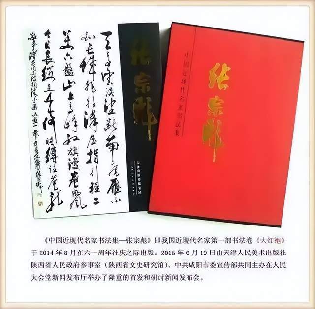 张宗彪还出版有:《中国近现代名家书法集一一张宗彪》即中国第一部书法卷《大红袍》。张宗彪书法大红袍己被批准为中国非物质文化遗产岀版物。张宗彪被授予非遗出版物书法传承人。