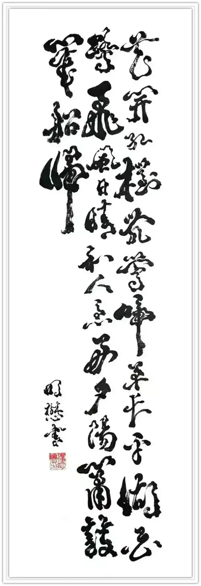 所以说湛明懋先生的根雕体书法作品,包括《滚滚长江东逝水》《柳暗花明又一村》《野度无人舟自横》等等,不仅书法线条全新的视觉享受,更是一种启迪心灵的滋生润养,书法第一次在根雕形态的作用见,贵显文采斐然,妙为风华绝代,这笔作新歌墨能新舞的根雕书法,全是一个个动人艺术新故以独特的笔墨韵律美,凝析出独一无二的审美价值,成为收藏和璧隋珠,价值连城。