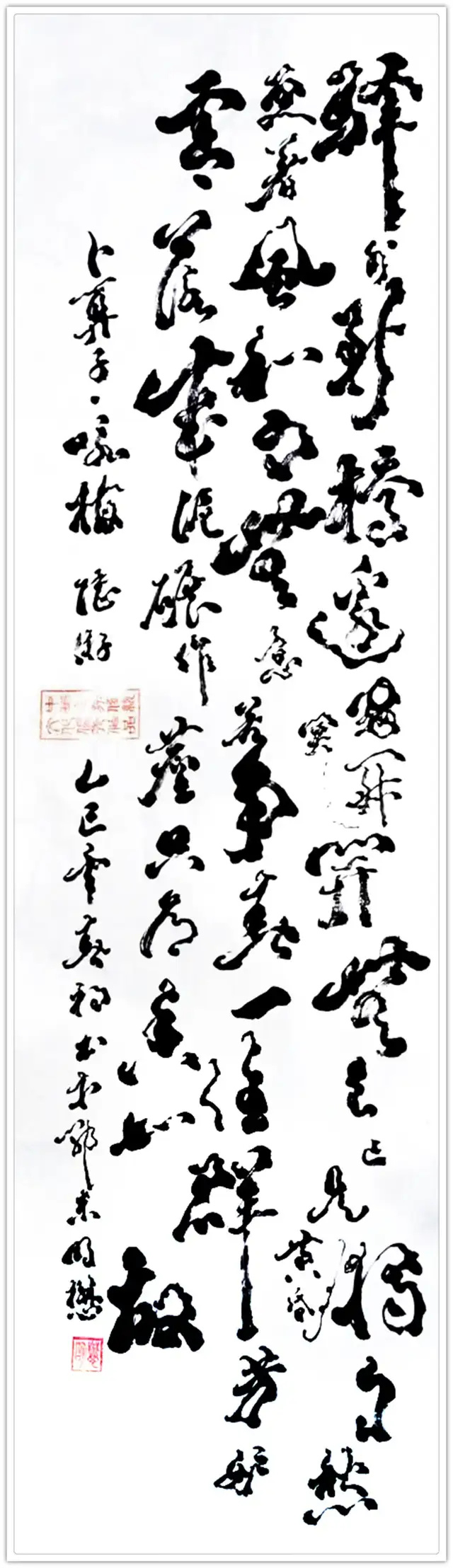湛明懋先生的根雕形态新书法,以其独特的艺术魅力,吸引了当代美学关注的方向,《赤壁赋》这件书法作品于笔墨间流露着旷达之气,用根雕意象抒发江山如画,一时多少豪杰的精气神,尽是妙笔生花,丰神迥异!《寿比南山》 里有精妙用笔构思,成功地将笔墨姿态与自然生态融为一体,把作品意境置于山之耸.立与川之流长的情态里,让书法也可以妙造自然,寓意岁月静好。《月 下独酌》则巧妙运用墨色变化,营造出静谧而深远的氛围,使人如临其境,在根雕线条的塑造里向外输出月光酒香,刚柔相济,意象丰富,最是莫使金樽空对月的情绪感怀!根雕书法不止于形态塑造奇观,更在于蕴含着虬龙之志鸾凤之姿的现实主义人文精神,成为生活的镜像与人生的底色!